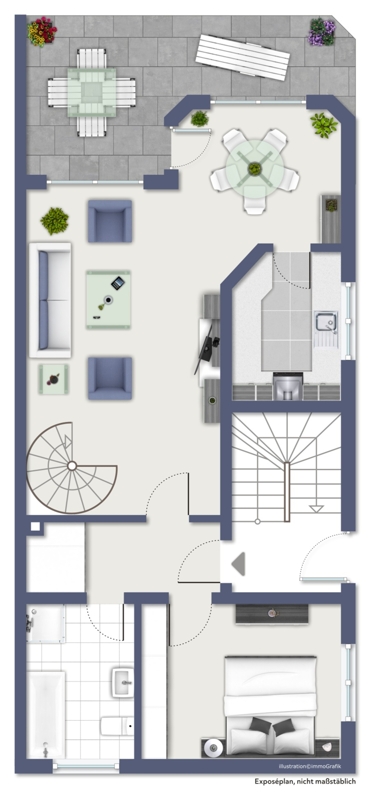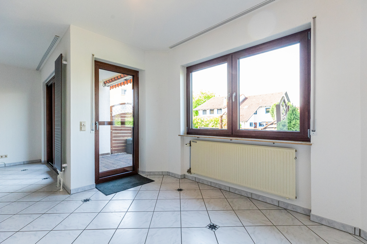 Diese Maisonette-Wohnung verbindet eine durchdachte Raumaufteilung mit wohnlicher Atmosphäre und viel Platz zum Wohlfühlen. Über den Eingangsbereich gelangen Sie in den Flur, von dem aus links das Schlafzimmer sowie ein großes Tageslichtbad erreichen. Auf der rechten Seite öffnet sich der großzügige Wohn- und Essbereich, der mit seiner offenen Gestaltung sehr einladend wirkt.Von hier gelangen Sie direkt in die angrenzende Küche sowie auf die Terrasse, die sich ideal für entspannte Stunden im Freien anbietet.
